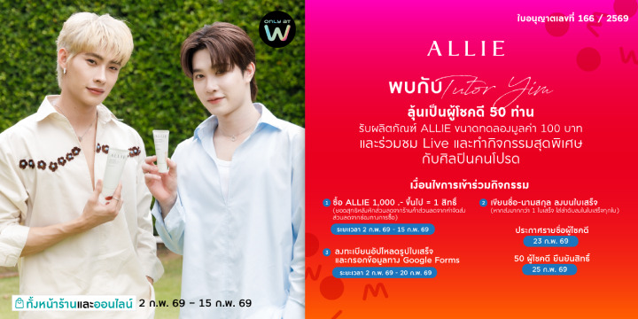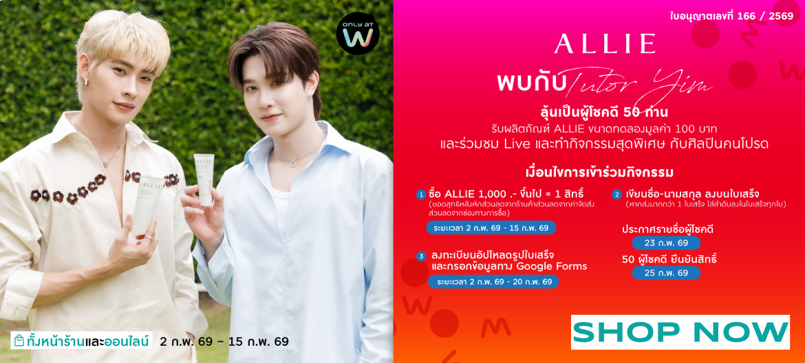 -ชอปสินค้าใด ๆ ก็ได้ ภายใต้แบรนด์ ALLIE (อัลลี่) ในประเทศไทย ที่ร้านวัตสัน และวัตสันออนไลน์ ตั้งแต่ 1,000 บาท ขึ้นไป (หลังหักส่วนลดทั้งหมด โดยไม่นำค่าใช้จ่ายอื่น ๆ เช่น ค่าดำเนินการจัดส่งผลิตภัณฑ์ ฯลฯ มาคำนวณร่วมด้วย) 1 สิทธิ์ ต่อ 1 ใบเสร็จ ตั้งแต่วันที่ 2 กุมภาพันธ์ 2569 ถึงวันที่ 15 กุมภาพันธ์ 2569 และกรอกข้อมูลภายในวันที่ 20 กุมภาพันธ์ 2569 (ซึ่งสถานะการซื้อจะต้องชำระเงินสำเร็จภายในวันที่ 15 กุมภาพันธ์ 2569 และในกรณีการสั่งซื้อสินค้าทางร้านค้าออนไลน์จะต้องมีสถานะการจัดส่งสำเร็จ โดยไม่มีการยกเลิก และ/หรือคืนสินค้า)