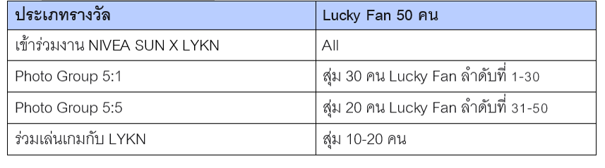 ร่วมลุ้นเป็น 50 Lucky Fans เพียงซื้อผลิตภัณฑ์ NIVEA SUN ที่ร่วมรายการ ณ ร้านค้าที่กำหนด ลุ้นรับรางวัลพิเศษจากนีเวียที่พร้อมเสิร์ฟความสนุก รับชมมินิคอนเสิร์ตจาก LYKN กับกิจกรรมและสิทธิพิเศษมากมายสำหรับแฟนคลับ ในวันที่ 7 ธันวาคม 2568 โดยมีเงื่อนไขและรายละเอียด คือ