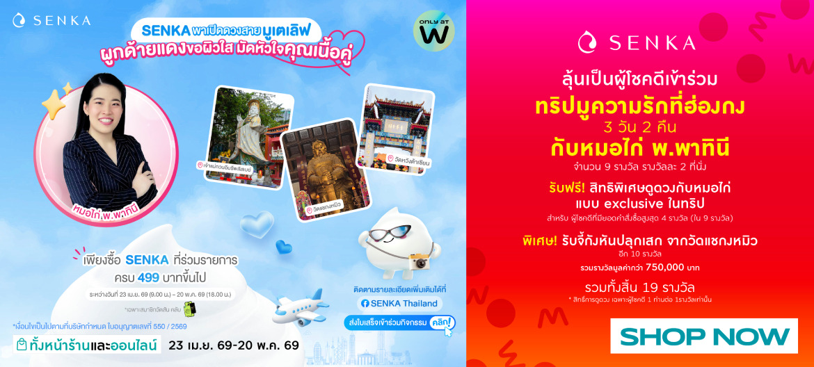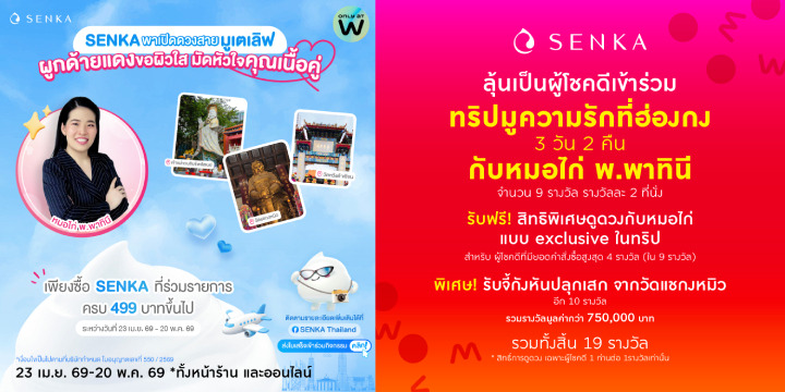 ต่อที่ 1 เข้าร่วมทริป SENKA พาเปิดดวงสายมูเตเลิฟ ผูกด้ายแดงขอผิวใส มัดหัวใจคุณเนื้อคู่ กับหมอไก่ พ.พาทินี ที่ฮ่องกง 3 วัน 2 คืน ทั้งหมด 9 รางวัล มูลค่ารางวัลละ